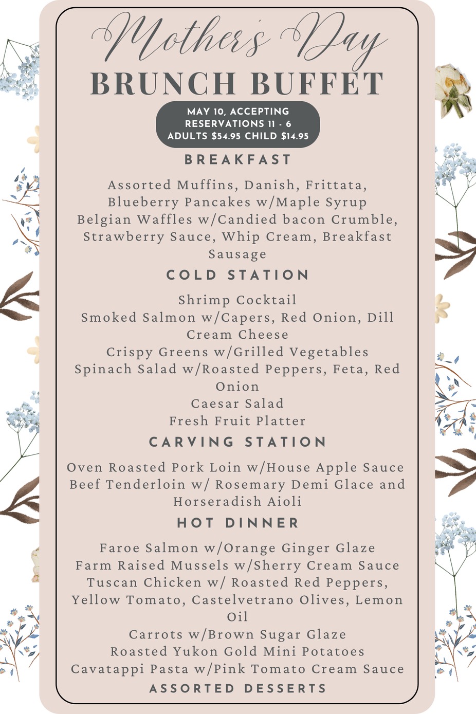 Come celebrate Mothers Day with us for our brunch buffet. Accepting reservations from 11am to 6pm. $54.95 for adults and $14.95 for children.